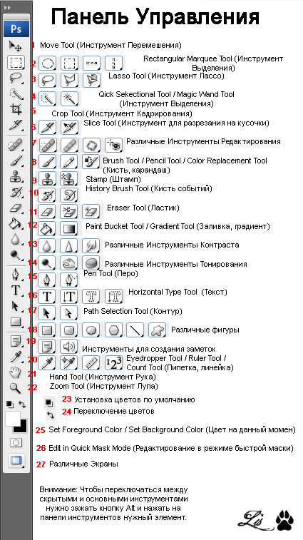Инструмент 25 Указывает какой цвет находится на переднем плане, а какой на заднем в палитре.